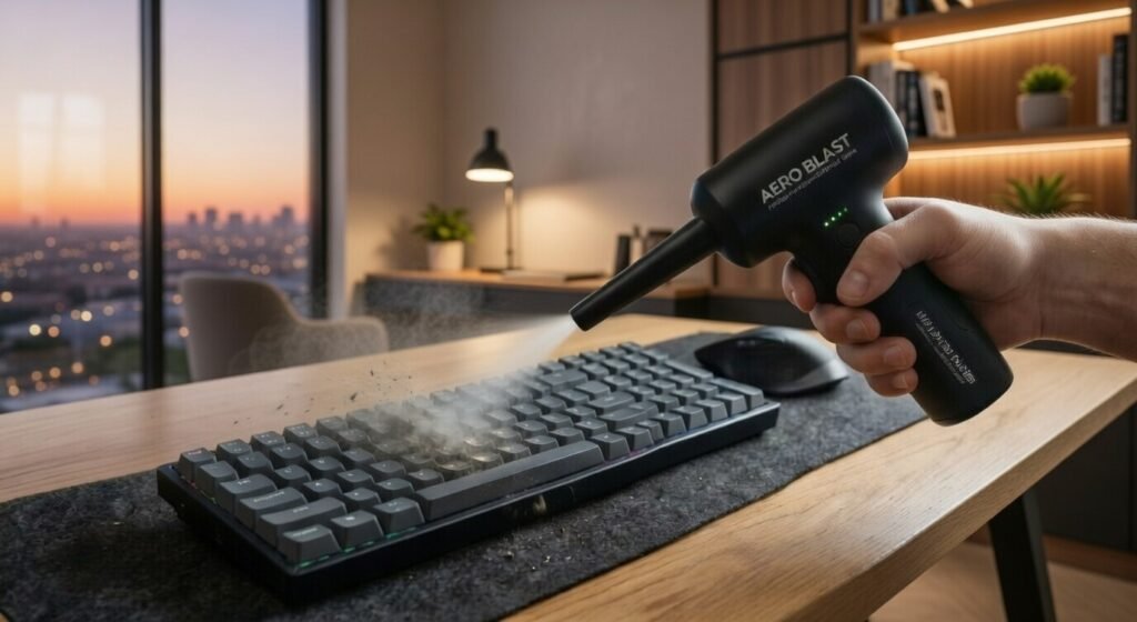 An electric air duster is a reusable, rechargeable device that generates powerful airflow to clean dust and debris from electronic devices, keyboards, computer components, and other hard-to-reach places. It’s a more eco-friendly alternative to disposable canned air.
